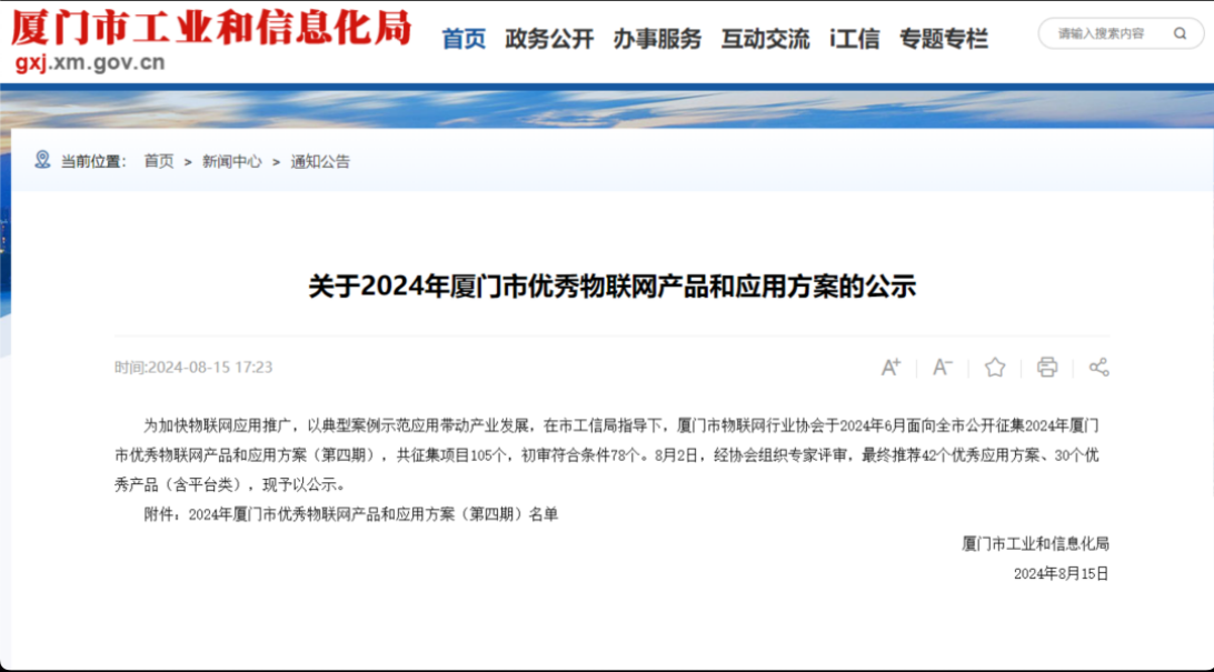 为加快推动物联网行业应用和产业发展,厦门市物联网行业协会在厦门市工业和信息化局(以下简称“厦门市工信局”)的指导下,组织开展2024年厦门市优秀物联网产品和应用方案(第四期)征集活动,面向全市公开征集优秀产品及应用方案。