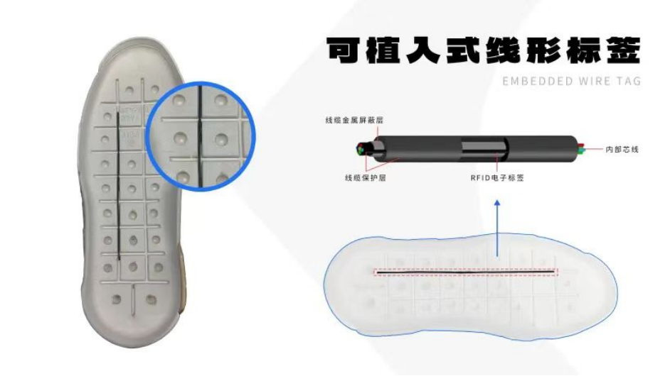 4.创新性:在鞋类行业应用中,常规的用法是将RFID贴纸贴于鞋底,易产生出油、掉标的问题,而将植入式线形标签应用于鞋底,有效解决标签损坏问题的同时也全面提升了产品管理效果。